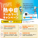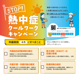 厚生労働省は、5月から9月まで「STOP!熱中症 クールワークキャンペーン」を実施して、職場における熱中症予防対策の徹底を図っています。