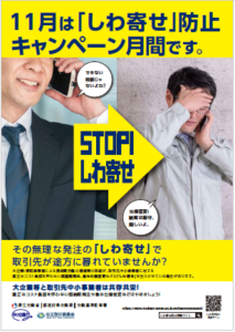 また厚生労働省では新たに11月を「「しわ寄せ」防止キャンペーン月間」と位置づけて、大企業等の働き方改革に伴う「しわ寄せ」の防止に向けた集中的・効果的な取組みのため、公正取引委員会・中小企業庁が実施する「下請取引適正化推進月間」との連携を図りながら、経営トップセミナーの開催など「過重労働解消キャンペーン」を実施しています。
